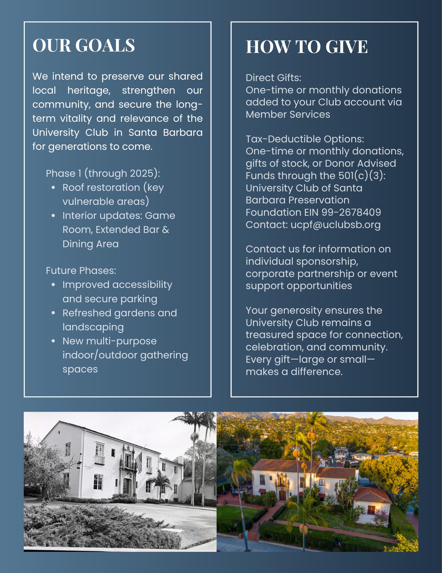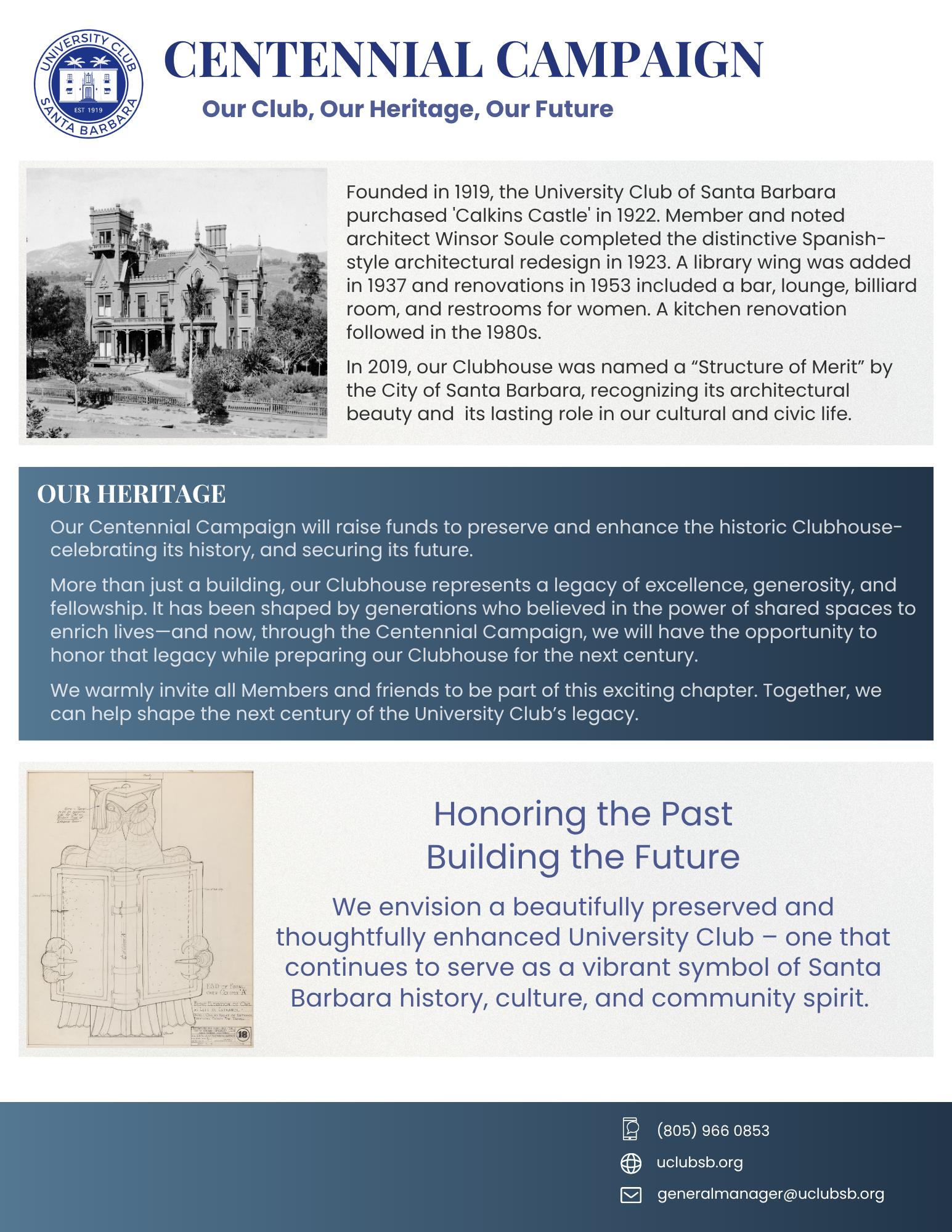 Centennial Campaign: Our Centennial Campaign, which is raising funds to preserve and enhance our beloved and historic clubhouse, was launched this year and is now in full swing. More than just a building, our Clubhouse represents a legacy of excellence, generosity, and fellowship. It has been shaped by generations who believed in the power of shared spaces to enrich lives—and now, through the Centennial Campaign, we will have the opportunity to honor that legacy while preparing our Clubhouse for the next century and ensuring its endurance and vibrancy for ourselves and generations to come. This crucial effort will continue to be at the heart of our planning and focus for the upcoming fiscal year and beyond. We envision a beautifully preserved and thoughtfully enhanced University Club – one that continues to serve as a vibrant symbol of Santa Barbara history, culture, and community spirit.