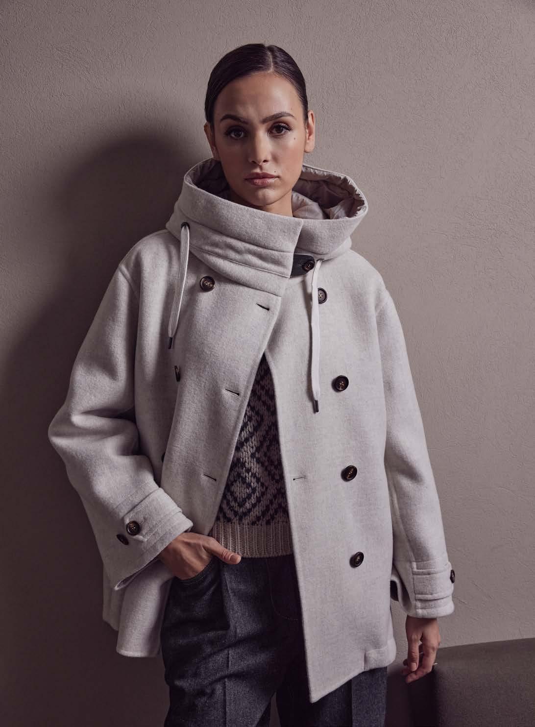WESTE HERNO 549.–, PULLOVER ALLUDE 475.–, HOSE NINE IN THE MORNING 269.90, SCHUHE COPENHAGEN 249.–