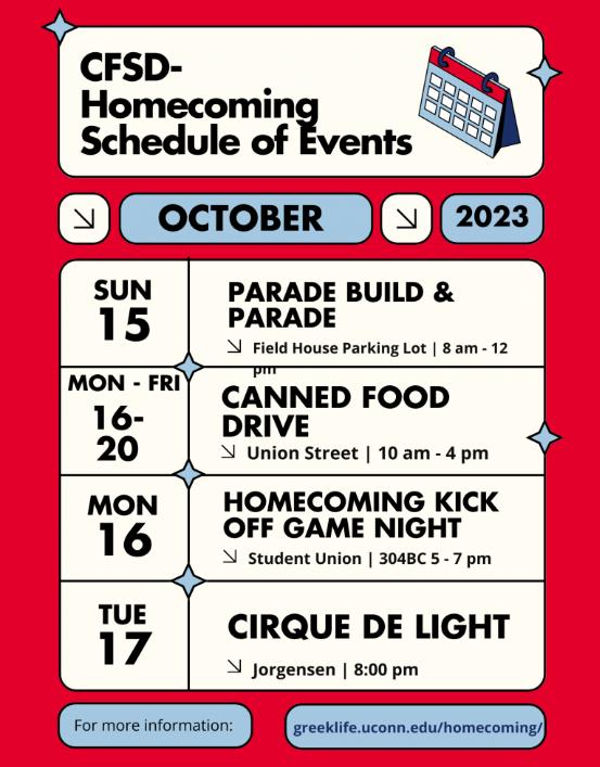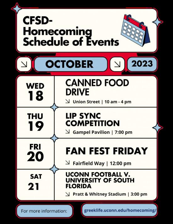 For more information, please check out our website https://greeklife.uconn.edu/ or follow us on social media @uconncfsd UPCOMINGEVENTS: Community Day: Field Day 10/7/23 - 12 - 3 PM - Husky Village Community days are events for UConn's Fraternity & Sorority community that takes into account our shared values whether through service or social events. The CFSD office will be hosting a field day this month! Come out and join us for some fun.