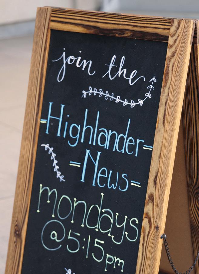 HHave an idea, opinion, or visual you just can’t get out of your head? Whether you’re a photographer, writer, or designer, the Highlander is ready to get you pub lished. Join us every Monday at 5:15 p.m. in HUB 101 to learn more.