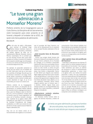 on 86 años de edad y dificultades para caminar, el Cardenal Jorge Medina Estévez mantiene intacta la lucidez para evocar recuerdos y anécdotas del pasado, algunas de ellas con el recientemente fallecido Monseñor Antonio Moreno Casamitjana. Por la amistad que los unió durante muchos años, quiso estar presente en la Misa y funeral en la Catedral de Concepción, donde luego recordó pasajes en torno a un camino recorrido que los juntó en distintas etapas de la vida. Por ejemplo, el purpurado rememoró la última vez que estuvo con el fundador de la UCSC, hace poco más de un mes antes de su partida, en Santiago. Recordó que tras el almuerzo sostuvieron una larga charla, donde ambos conversaron animadamente. Su invitado se retiró a tomar la siesta, pero cuando abandonó el lugar, él ya no se encontraba, por lo que no lo volvió a ver. Prefecto emérito de la Congregación para el Culto Divino y la Disciplina de los Sacramentos, el Cardenal Medina además fue miembro de las congregaciones para el Clero, para los Obispos y para la Doctrina de la Fe, y de los pontificios consejos para la Familia y para los Textos Legislativos, así como de la Pontificia Comisión «Ecclesia Dei». Cardenal de la Iglesia desde 1998, ordenado por Juan Pablo II, en su condición de Cardenal Protodiácono del Colegio cardenalicio, en 2005 tuvo encima los ojos de todo el mundo cuando anunció Habemus Papam a Benedicto XVI. Hoy, con un rol menos activo en el funcionamiento de la Iglesia, ve con buenos