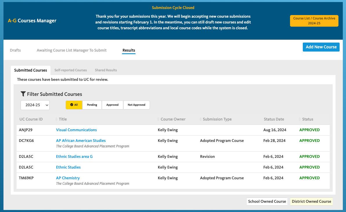 A-G list managers are highly encouraged to complete all updates to their course lists during the Primary Phase to ensure that course lists are up to date by the time the UC application is available to students on August 1.