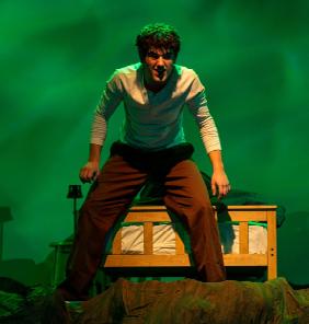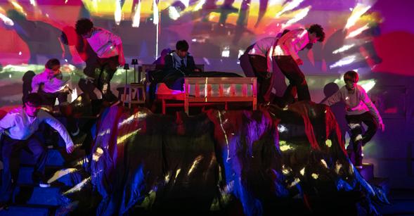 The production leaned heavily into physical theatre, with the cast working as a cohesive ensemble to shape the world around the central character. Moments of transformation and storytelling were achieved not through elaborate set changes, but through precise, disciplined movement. Inventive stage craft and clever choral movement were used to realise