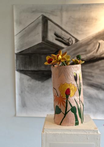 bridged the gap between observation and artistic expression. The variety of media on display reflects the ambition of the cohort, ranging from expressive charcoal and precision pencil drawings to rich oil and acrylic paintings. The collection of work further showcases watercolour painting, mixed media cyanotypes, monoprints, and ceramic sculptures. These works represent more than just technical proficiency;