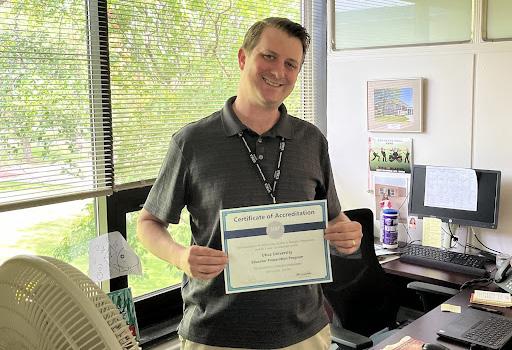 Kyle Riecker holding the AAQEP Certificate of National Accreditation for the Utica University Educator Preparation Program. //Photo: Kayden Lamphere