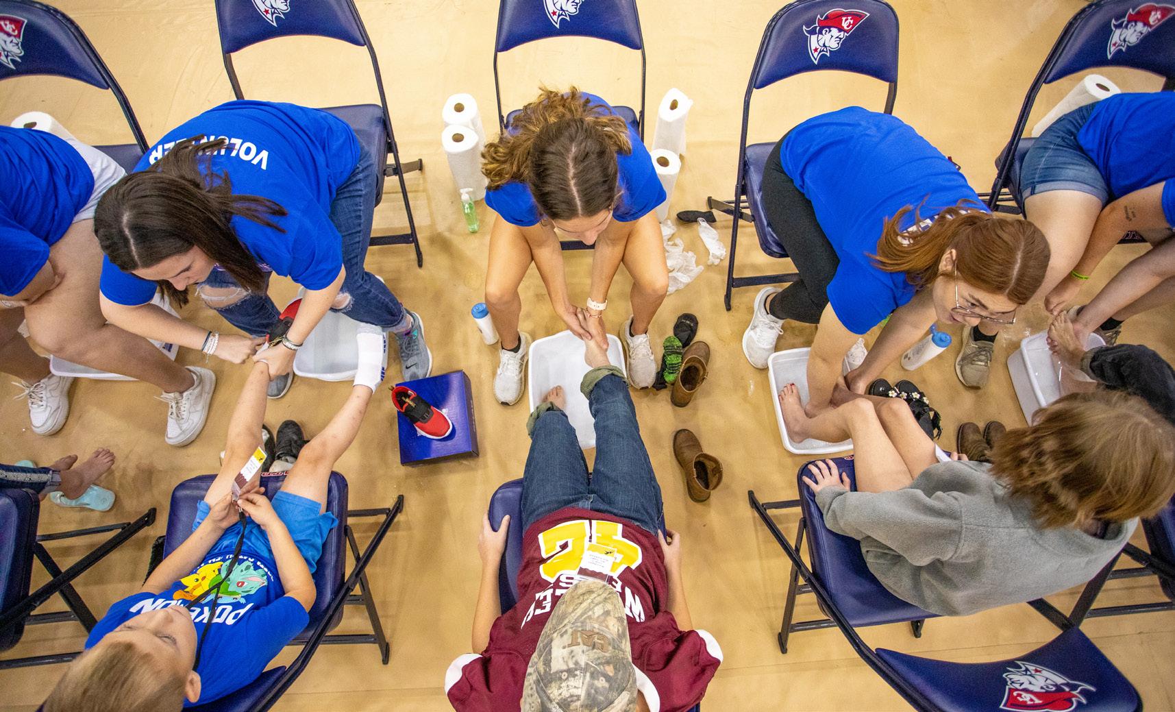 Big gymnasium. Little kids. College students. Activity books. Foot washing stations. New socks, shoes, t-shirts, and hygiene items. Conversation, laughter, and smiles – plenty of smiles. Welcome to Shoes 4 the Soul 2022!