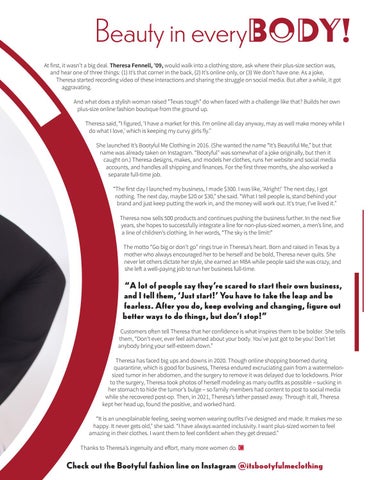 Beauty in every At first, it wasn’t a big deal. Theresa Fennell, ’09, would walk into a clothing store, ask where their plus-size section was, and hear one of three things: (1) It’s that corner in the back, (2) It’s online only, or (3) We don’t have one. As a joke, Theresa started recording video of these interactions and sharing the struggle on social media. But after a while, it got aggravating. And what does a stylish woman raised "Texas tough" do when faced with a challenge like that? Builds her own plus-size online fashion boutique from the ground up. Theresa said, “I figured, ‘I have a market for this. I’m online all day anyway, may as well make money while I do what I love,’ which is keeping my curvy girls fly.” She launched It’s Bootyful Me Clothing in 2016. (She wanted the name “It’s Beautiful Me,” but that name was already taken on Instagram. “Bootyful” was somewhat of a joke originally, but then it caught on.) Theresa designs, makes, and models her clothes, runs her website and social media accounts, and handles all shipping and finances. For the first three months, she also worked a separate full-time job. “The first day I launched my business, I made $300. I was like, ‘Alright!’ The next day, I got nothing. The next day, maybe $20 or $30,” she said. “What I tell people is, stand behind your brand and just keep putting the work in, and the money will work out. It’s true; I’ve lived it.” Theresa now sells 500 products and continues pushing the business further. In the next five years, she hopes to successfully integrate a line for non-plus-sized women, a men’s line, and a line of children’s clothing. In her words, “The sky is the limit!” The motto “Go big or don’t go” rings true in Theresa’s heart. Born and raised in Texas by a mother who always encouraged her to be herself and be bold, Theresa never quits. She never let others dictate her style, she earned an MBA while people said she was crazy, and she left a well-paying job to run her business full-time.