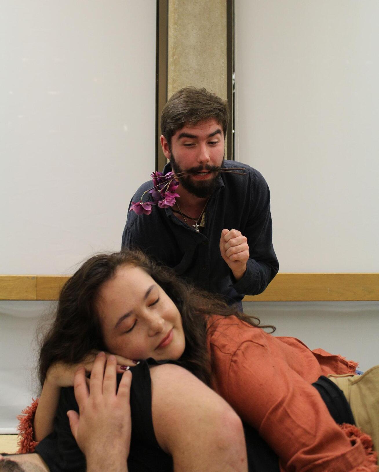JP: Something we discussed in rehearsal is the performative male vibe. A man who pretends to have all these interests that he thinks girls find attractive. [Lysander’s] love for Hermia at the beginning is carefully sculpted by him and very, very artificial. He’s putting on a performance for Hermia. It’s very literally the definition of performative. That’s something unique, because the term “performative male” has only been coined very recently.