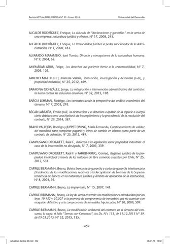 ALCALDE RODRÍGUEZ, Enrique, La cláusula de “declaraciones y garantías” en la venta de una empresa: naturaleza jurídica y efectos, Nº 17, 2008, 243. ALCALDE RODRÍGUEZ, Enrique, La Personalidad Jurídica el poder sancionador de la Administración, N° 1, 2000, 183. ALVARADO MARAMBIO, José Tomás, Divorcio y concepciones de la naturaleza humana, N° 9, 2004, 65. AMENÁBAR ATRIA, Felipe, Los derechos del paciente frente a la responsabilidad, N° 7, 2003, 105. ARROYO MATTEUCCI, Marcela Valeria, Innovación, investigación y desarrollo (I+D), y propiedad industrial, N° 25, 2012, 469. BARAONA GONZÁLEZ, Jorge, La integración e intervención administrativa del contrato: la lucha contra las cláusulas abusivas, N° 32, 2015, 105. BARCIA LEHMAN, Rodrigo, Los contratos desde la perspectiva del análisis económico del derecho, N° 7, 2003, 293. BÉCAR LABRAÑA, Emilio José, la destrucción y el deterioro culpable de la especie o cuerpo cierto debido como una hipótesis de incumplimiento y la procedencia de la resolución del contrato, N° 29, 2014, 387. BRAVO VALLEJOS, Rodrigo y JUPPET EWING, María Fernanda, Cuestionamiento de validez del mandato para completar pagarés y letras de cambio en blanco como parte de un contrato de adhesión, N° 25, 2012, 489. CAMPUSANO DROGUETT, Raúl F., Reforma a la legislación sobre propiedad industrial: el caso de la información no divulgada, N° 7, 2003, 339. CAMPUSANO DROGUETT, Raúl F. y FAHRENKRUG, Conrad, Régimen jurídico de la propiedad intelectual a través de los tratados de libre comercio suscritos por Chile, N° 25, 2012, 531. CAPRILE BIERMANN, Bruno, Boleta bancaria de garantía y carta de garantía interbancaria (Incidencias de las modificaciones recientes a la Recopilación de Normas de la Superintendencia de Bancos en la naturaleza jurídica y ámbito de aplicación de la institución), N° 8, 2003, 95. CAPRILE BIERMANN, Bruno, La imprevisión, N° 15, 2007, 141. CAPRILE BIERMANN, Bruno, La ley de venta en verde: las modificaciones introducidas por las leyes 19.932 y 20.007 a la promesa de compraventa de inmuebles que no cuentan con recepción definitiva y a la compraventa de inmuebles hipotecados, Nº 20, 2009, 509. CAPRILE BIERMANN, Bruno, La modificación unilateral del contrato en el derecho del consumo; la saga: el fallo “Sernac con Cencosud”, los Ds. N°s 153, de 19.12.2013 N° 39, de 09.03.2015, Nº 32, 2015, 135.