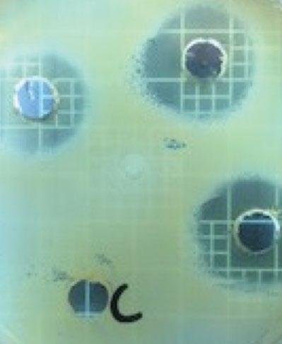 ticaseína solidificado, posteriormente se realizaron cuatro perforaciones. En tres de los pozos se colocó el sobrenadante; en el cuarto se colocó caldo MRS concentrado, como control negativo. Las placas se incubaron a 37°C durante 24 horas y, posteriormente, se midió el diámetro de los halos de inhibición con un calibrador Vernier digital; se realizaron tres mediciones a cada uno de los halos de inhibición. Todas las pruebas se realizaron por duplicado.