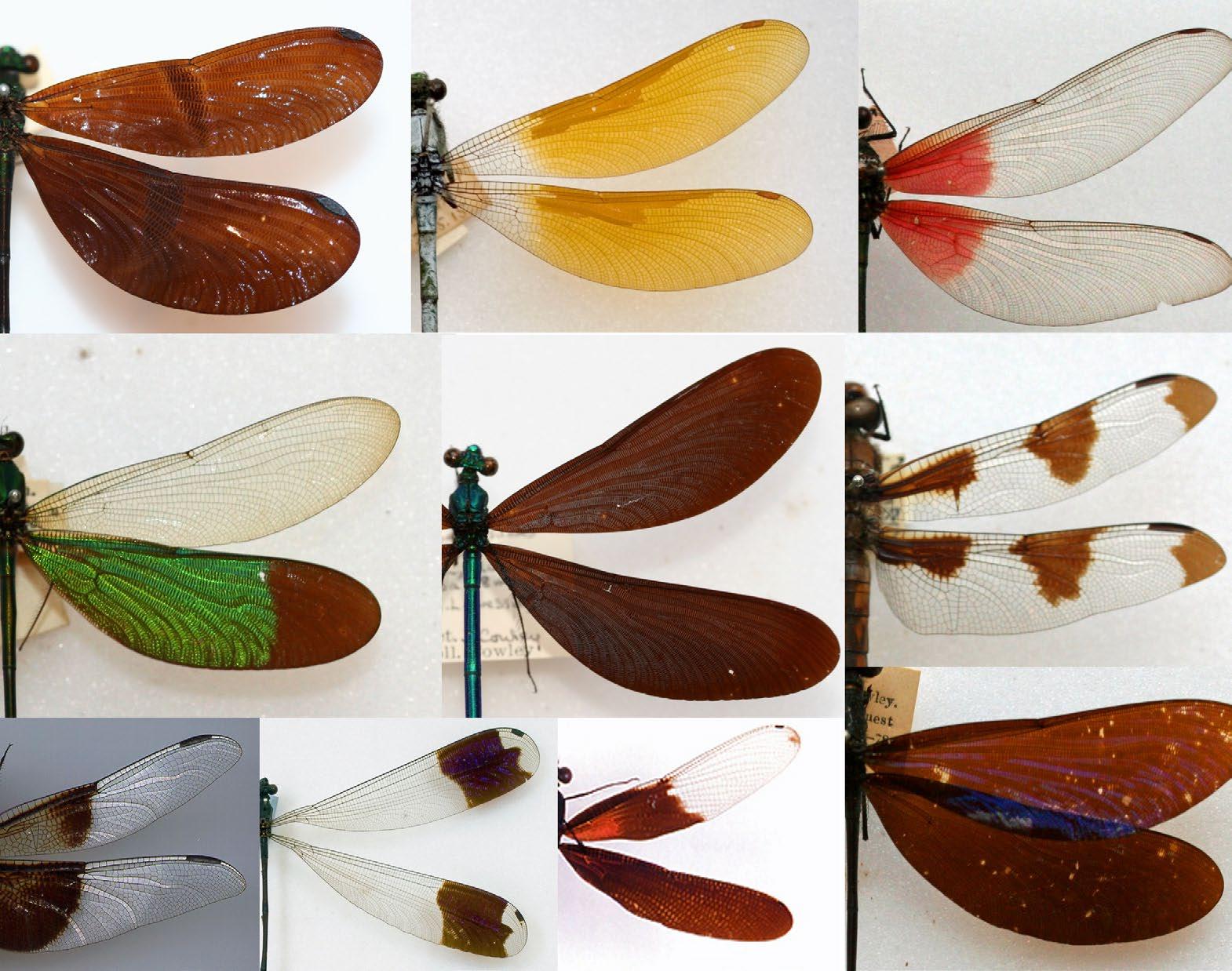 Figura 2. Variaciones en el color de las alas en libélulas y caballitos del diablo machos, desde tonos oscuros, blancos, hasta anaranjados, rojos y verdes. La especie Neurobasis chinensis (centro, izquierda), exhibe una coloración verde metálica en dos de sus alas y ha desarrollado iridiscencia —un fenómeno óptico en el que el tono de la luz varía de acuerdo con el ángulo desde el cual se observe la superficie—. En otras especies, como Libellula luctuosa (esquina inferior izquierda) se pueden observar contrastantes tonos negros y blancos.