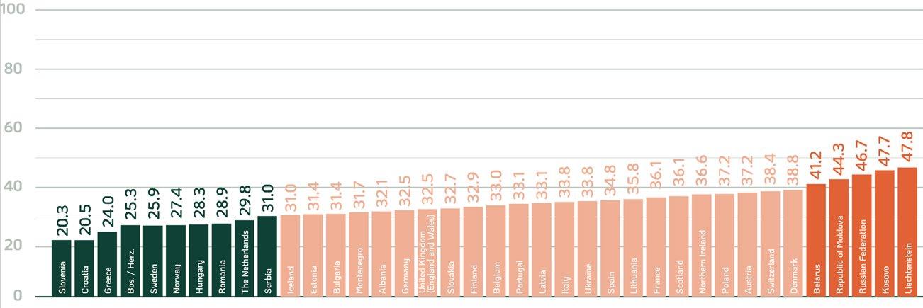 points), 22) Latvia (33.14 points), 23) Italy (33.78 points), 24) Ukraine (33.84), 25) Spain (34.81 points), 26) Mongolia (35.02 points), 27) Lithuania (35.78 points), 28) France (36.06 points), 29) Scotland (36.09 points), 30) Northern Ireland (36.61 points), 31) Poland (37.20 points), 32) Austria (37.24 points), 33) Japan (37.67 points), 34) Republic of Korea (37.71 points), and 35) Switzerland (38.42 points).