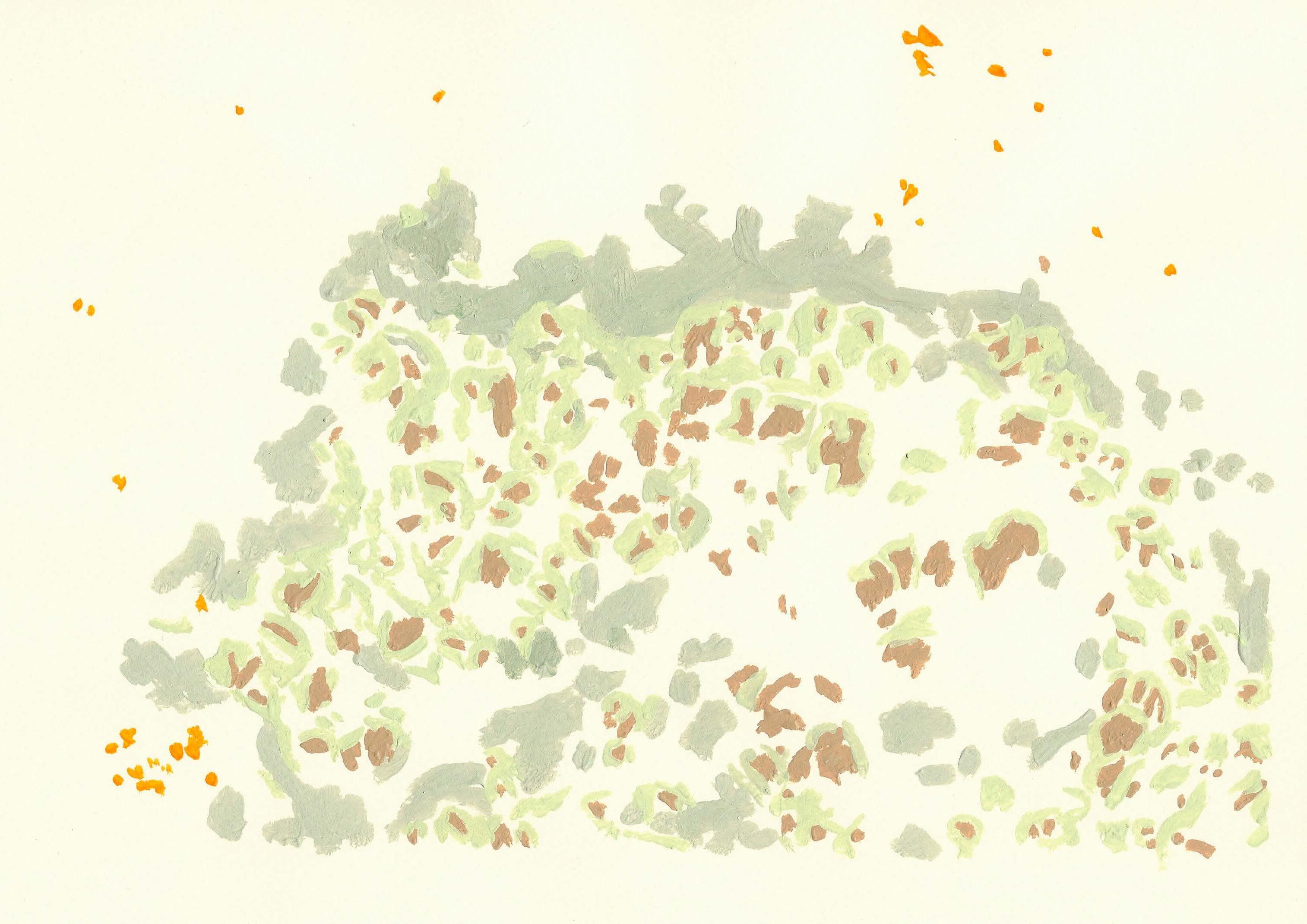 La inspiración para este libro y las pinturas que contiene surge a partir de una atenta observación del entorno. En derredor se encuentran organismos, como los líquenes, que en nuestro día a día tienden a pasar desapercibidos al ojo humano. Los líquenes están compuestos por un hongo, alga y cianobacterias que se juntan para poder sobrevivir en lugares adversos. Son considerados organismos simbióticos, lo cual significa que se unen para crear una relación íntima que les permite vivir. De esta manera, conforman mundos enteros dentro de nuestro propio mundo y crean ecosistemas armónicos para poder seguir creciendo.
