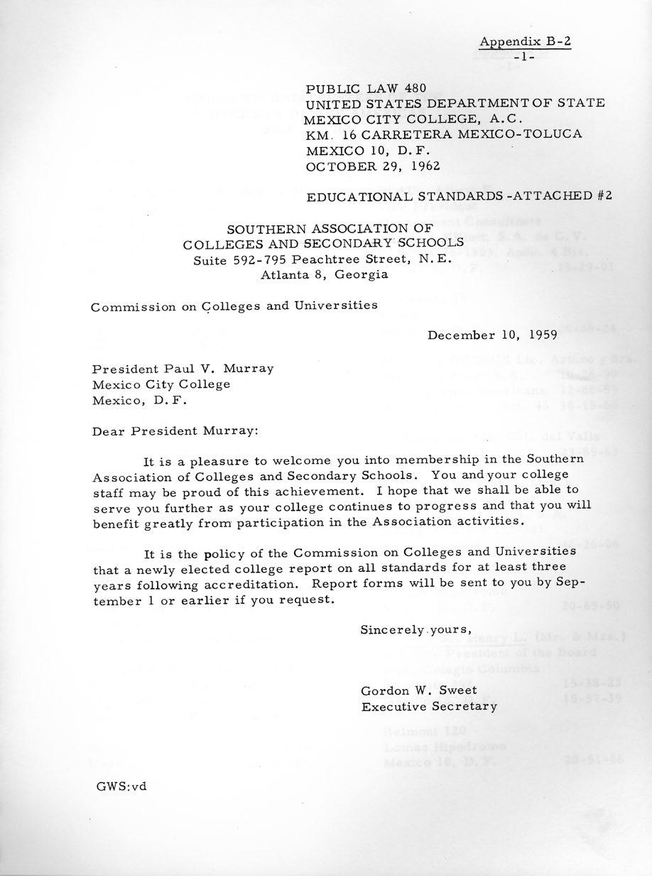 Por otra parte, el mcc requería pertenecer a asociaciones educativas en Estados Unidos que validaran sus programas de estudios. En 1949, la institución intentó obtener su acreditación por la Southern Association of Colleges and Schools (sacs), organismo estadounidense que otorga reconocimiento a colleges y universidades de la región sur de dicho país, pero también a instituciones de educación superior a nivel internacional. La solicitud fue negada debido a que el mcc no cumplía con muchos de los requisi-