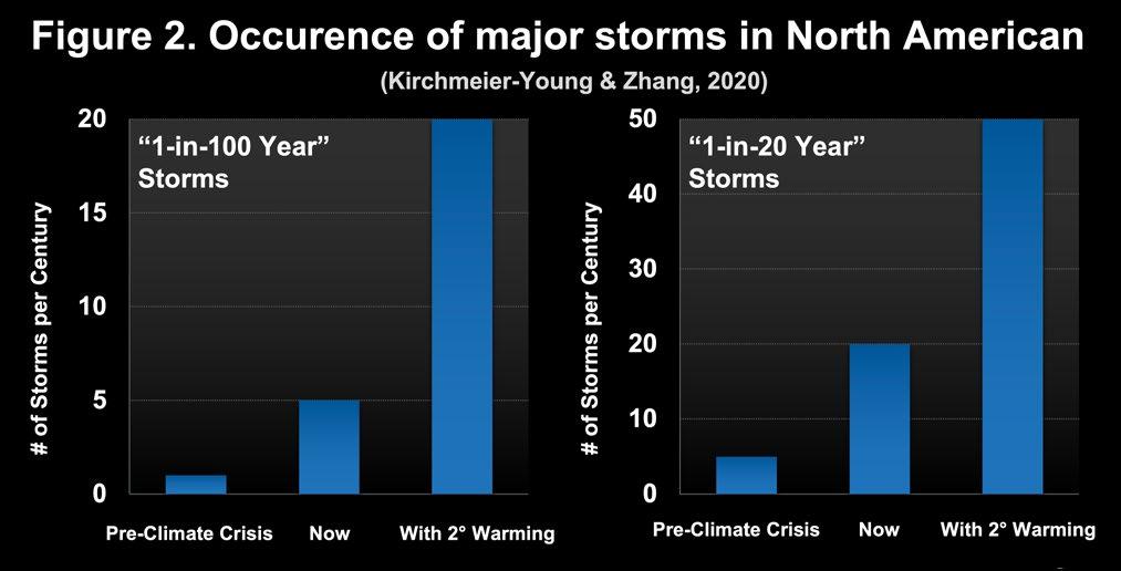 “At the regional level, in North America, the average severe rainfall is predicted to dramatically reduce in return periods” por “Regionally, in North America average extreme precipitation is projected to show dramatic reductions in return periods”. Indeed, one-in-20-year events have now been turned into one-in-5 year events. This is happening with a warming of ~+1°C (compared to the climate of the pre-industrial era). Meanwhile one-in-50 year events have been transformed into one-in-10 year events, and one-in-100 year events are now basically onein-20-year events (Kirchmeier-Young and Zhang, 2020).
