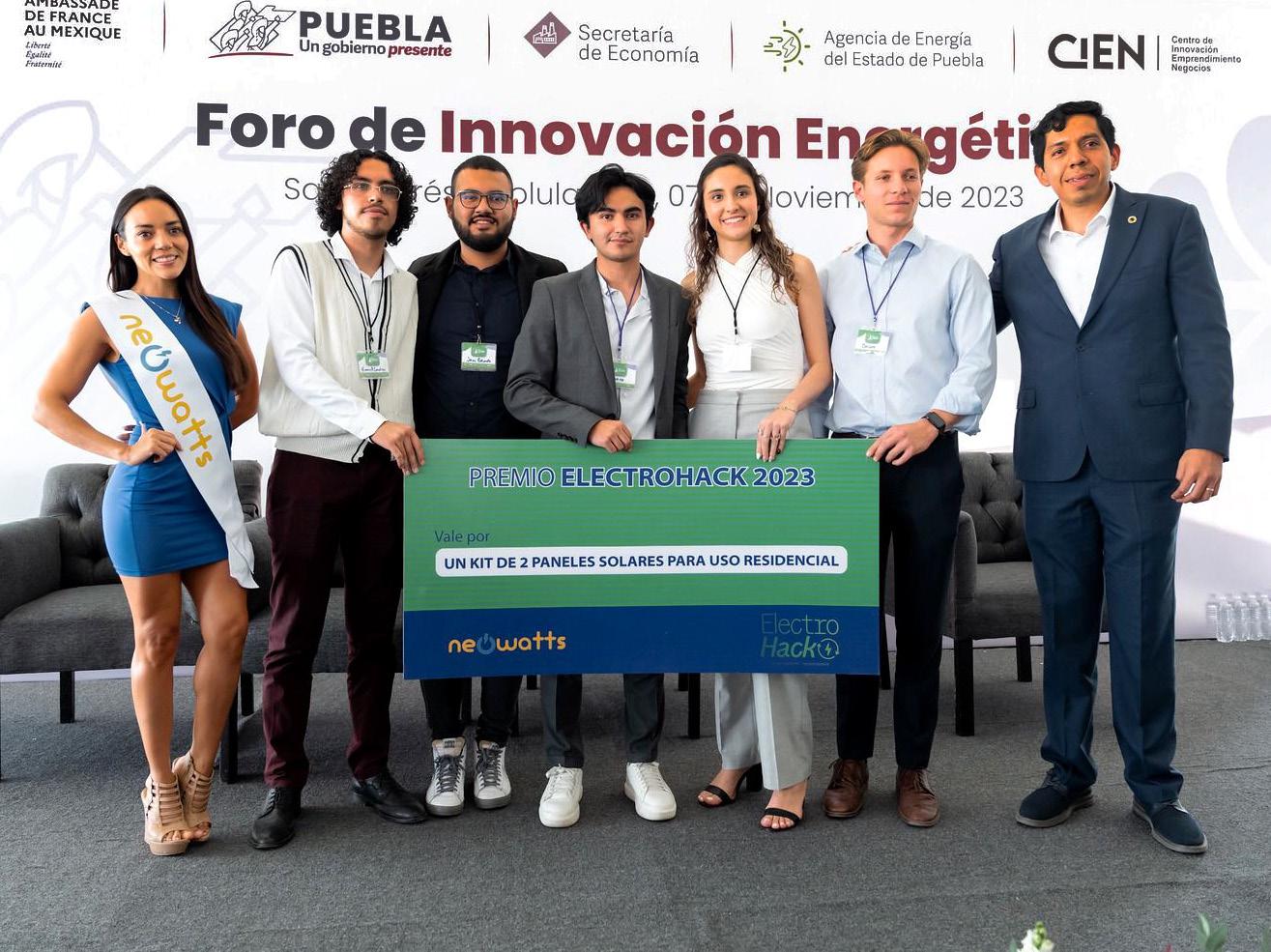 Noé Franco González, José Eduardo González Galicia, Juan Bosco Mastretta Larracilla, Manuel Cardoso Sánchez y Aranza Rodríguez San Román, estudiantes de Ingeniería, obtuvieron el tercer lugar del ElectroHack, concurso organizado por la Agencia de Energía del Estado de Puebla, enfocado a proponer soluciones en materia de energía limpia y electromovilidad.