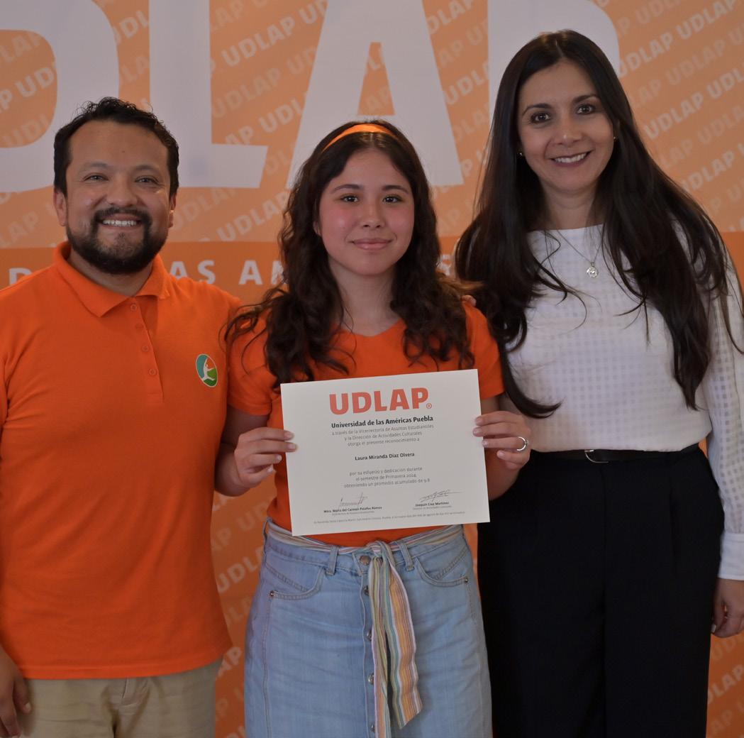 La UDLAP otorgó apoyos educativos artísticos a jóvenes de nuevo ingreso, quienes se incorporarán a partir de Otoño 2024 a alguno de sus Equipos Representativos Culturales (ERC). Asimismo, se otorgó un reconocimiento a Laura Miranda Díaz Olvera, miembro de la Orquesta Symphonia, y a Ana Betsabé Torres de la Luz, integrante del ballet folclórico Zentzontle, por obtener los mejores promedios dentro del programa de ERC.