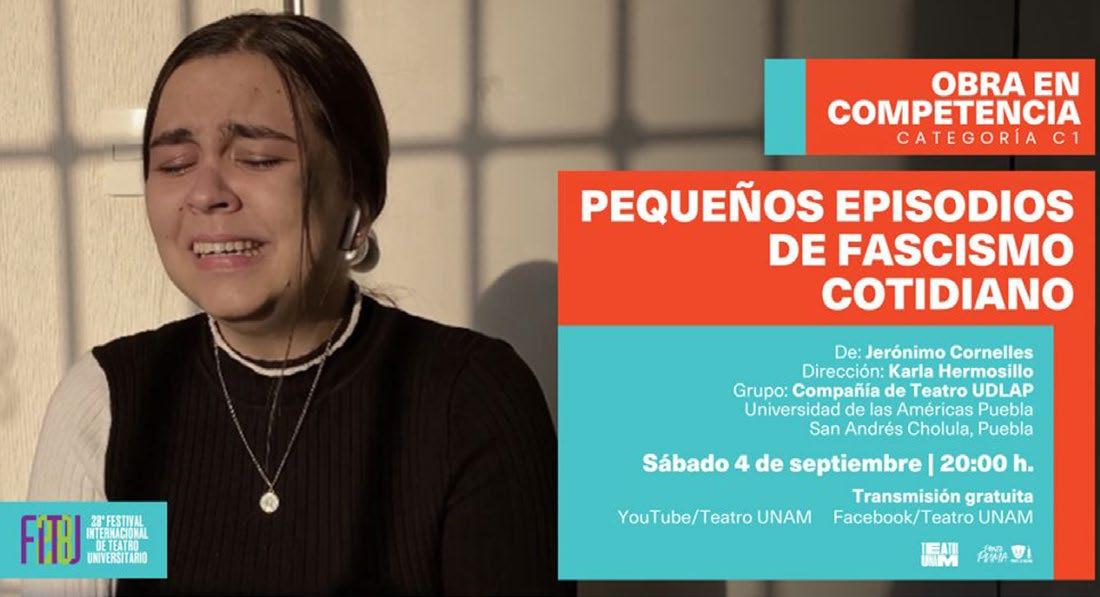 La obra Pequeños episodios de fascismo cotidiano, dirigida por Karla Hermosillo, estudiante de la Licenciatura en Teatro, fue seleccionada como finalista del 28 Festival Internacional de Teatro Universitario de la UNAM (FITU).