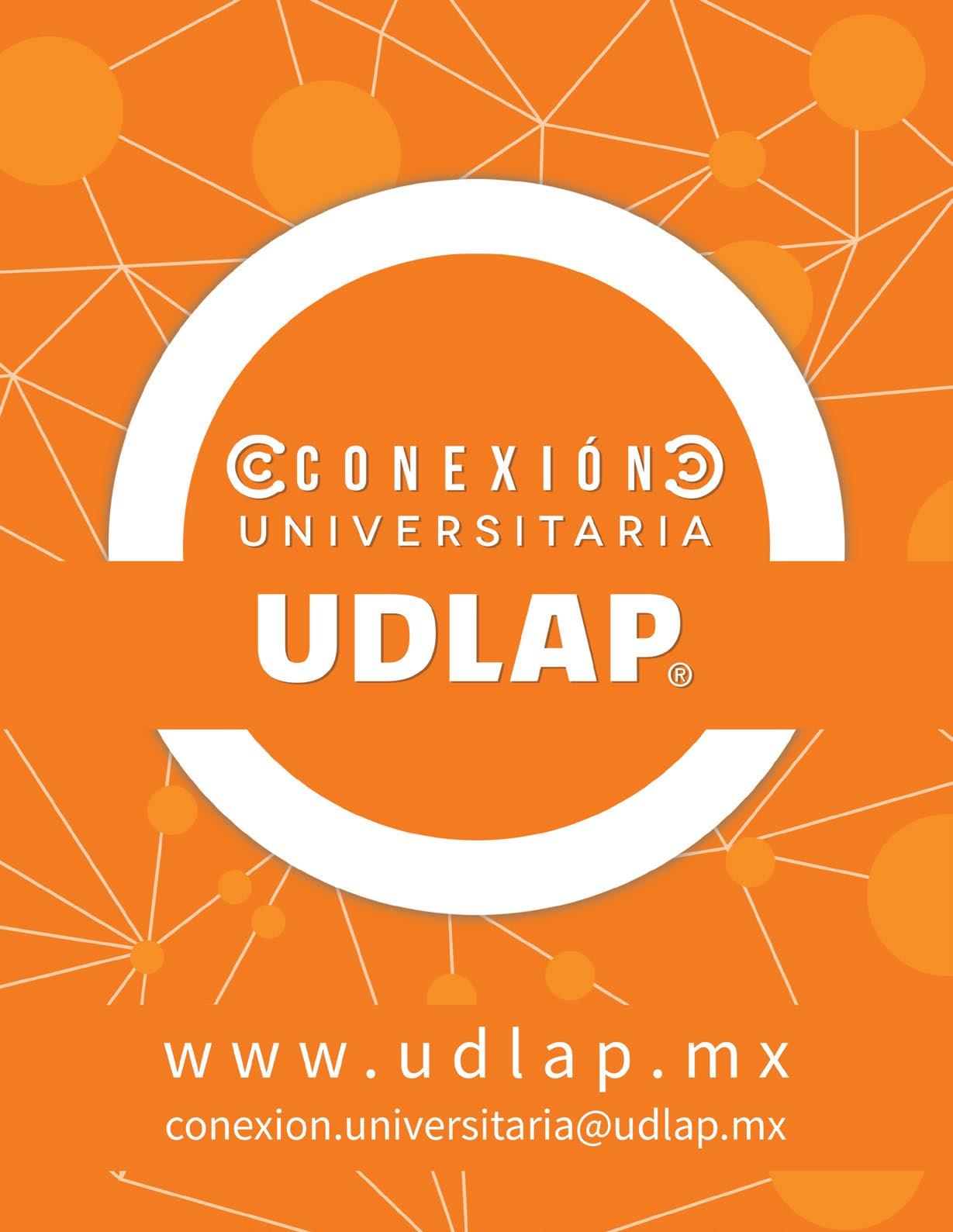CONEXIÓN, Año 1, núm. 2, 2019, es una publicación anual editada por la Fundación Universidad de las Américas, Puebla. Exhacienda Santa Catarina Mártir s/n, San Andrés Cholula, Puebla, C. P. 72810. Tel. (222) 229 20 00. www.udlap.mx, mariana.zozaya@udlap.mx. Editora responsable: Mariana Zozaya Rodríguez. Reserva de Derechos al Uso Exclusivo e ISSN: en trámite, ambos otorgados por el Instituto Nacional del Derecho de Autor. Licitud de Título y Contenido: en trámite, otorgado por la Comisión Calificadora de Publicaciones y Revistas Ilustradas de la Secretaría de Gobernación. Impresa en los Talleres de la Universidad de las Américas Puebla, Exhacienda Santa Catarina Mártir s/n, San Andrés Cholula, Puebla, C. P. 72810. Este número se terminó de imprimir el 30 de mayo de 2019, con un tiraje de 2500 ejemplares. Su distribución es gratuita.