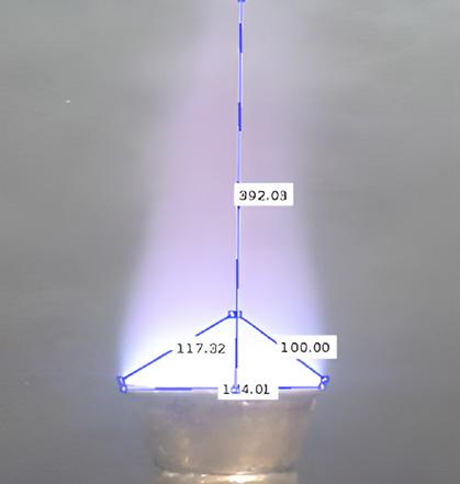 través del contorno delimitado en la figura 16. Como se mencionó anteriormente, la altura, el ancho y las distancias se obtuvieron mediante el uso de la herramienta «Regla» de matlab®, la cual permitió observar que las medidas de cambio de intensidad de la llama fueron de 392.03 pixeles, 174.01 pixeles, y 117.32 y 100 pixeles, respectivamente.