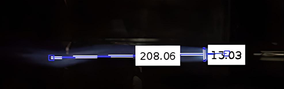 En la figura 13 se muestra la extracción de los principales puntos donde se limita la luz, a través del contorno delimitado en la figura 12. La altura, el ancho y las distancias se obtuvieron mediante el uso de la herramienta «Regla» de matlab® , la cual permitió observar que las medidas de cambio de intensidad de la llama fueron de 474.05 pixeles, 236.66 pixeles, y 130.12 y 115.38 pixeles, respectivamente.