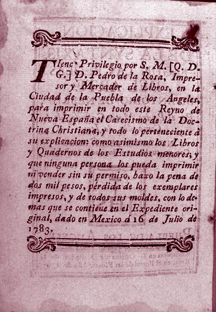 Privilegio. Aparece bajo la formulación: «Con privilegio» o «Con privilegio imperial». El privilegio es la concesión exclusiva que otorga el rey o virrey a una persona (impresor, editor, librero o autor) que solicita ser el único que pueda imprimir o vender una obra. También se podía dar para ser el único impresor de una ciudad (ver figura 14).