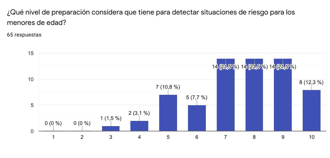 3ª)Laencuestaponedemanifiestoqueexistelapercepcióndequeelnivelderiesgo paralosmenoresenlasactividadesdelaFundaciónesmuybajo,enespecialenlo queserefiereaquesegenerensituacionesdemaltratoporpartedelpropiopersonal delaFundación.Sinembargo,seevidenciatambiénqueseconsideramásprobable quepuedanproducirsesituacionesderiegoderivadasdelaactuacióndeotros menoresdeedadoenelámbitofamiliar.Portanto,parececonvenientehacerespecial énfasisenaquellasmedidasdirigidasasensibilizaralospropiosmenoresyasu entornofamiliar,sinperjuicio,claroestádetrabajartambiéndemaneracontinuada conelcolectivodeprofesionales,colaboradoresyvoluntariosdelaFundación.