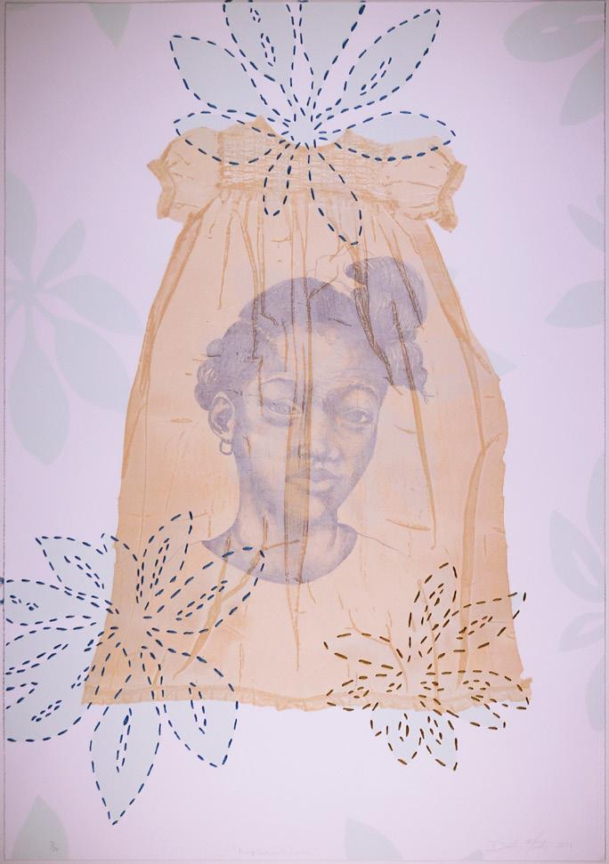 Artwork acquired with funds raised to diversify our art collections: Delita Martin, Delita, 2021. From the Keepsake series. Lithograph with collagraph and hand-stitching on paper. Museums Collections, Purchase.