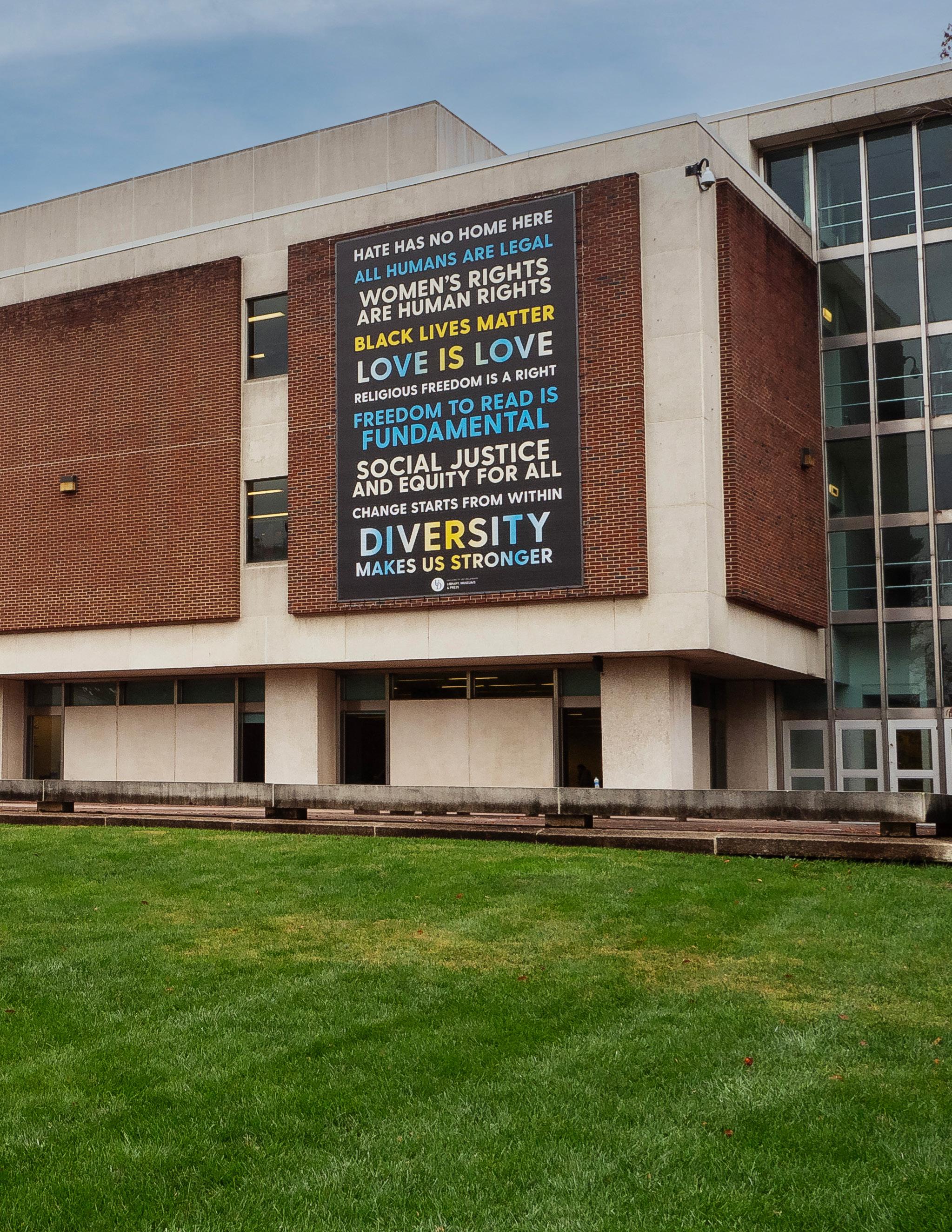 In the pages that follow, I hope you’ll learn more about the critical and intentional work we are doing in the equity, diversity, inclusion and accessibility space. We commissioned the banner you see on the next page, which hangs on the exterior of Morris Library, to celebrate our shared values and to serve as a visual reminder of our commitment to the community and each other.