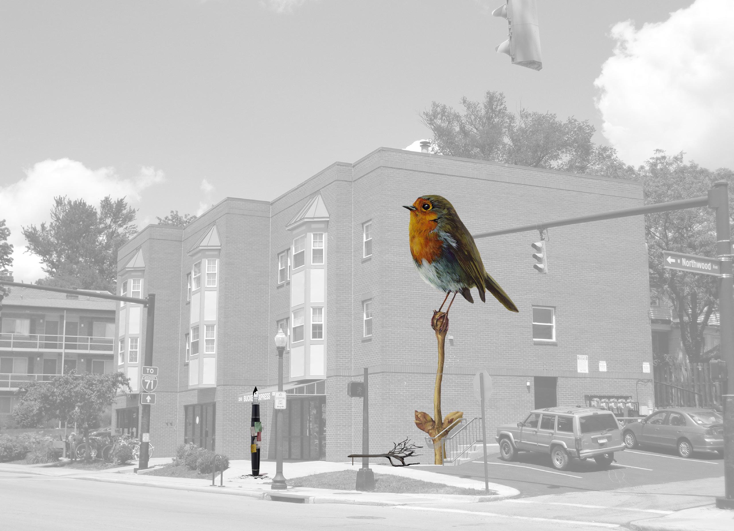 Throughout the University District there are several ‘neighborhood commercial nodes’ that occur. These nodes, which feature large areas of concrete in front of the storefronts, present opportunities to introduce artistic elements into important neighborhood meeting points and also help create unified visual cohesion of the District. A natural theme may work well as the University District has a distinctive tree canopy and is well integrated into the park system. Several options of potential bird displays have been rendered.