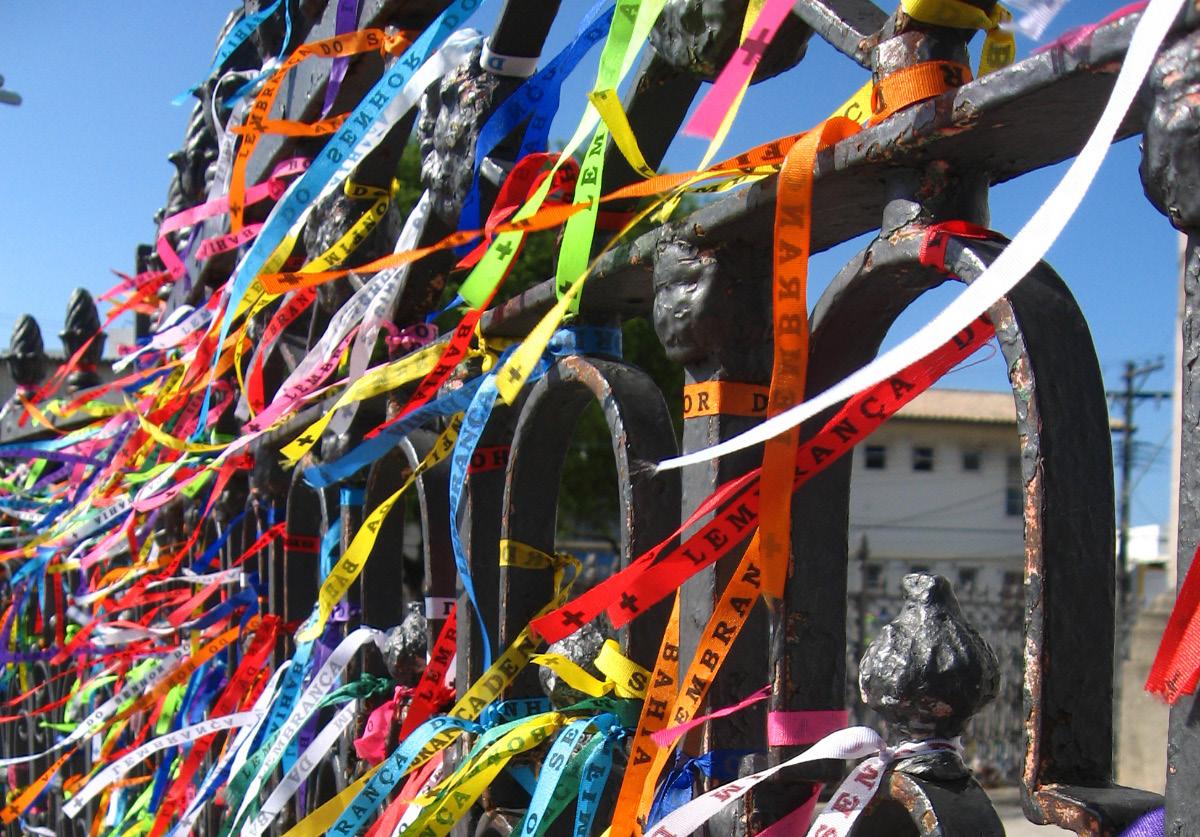 • Bahia Bands typically are ribbons with writings done by hand in silver or with ink. In the Brazilian tradition these were worn as a necklace, upon which holy images were hung. These are often now tied at physical locations such as church gates.