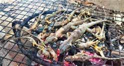 the dry season, Issan people hunt chameleons in trees in the forest. First, clean the guts with water. Grill until well cooked. Finely chop and mix with the prepared seasonings. Eat with hot sticky rice.