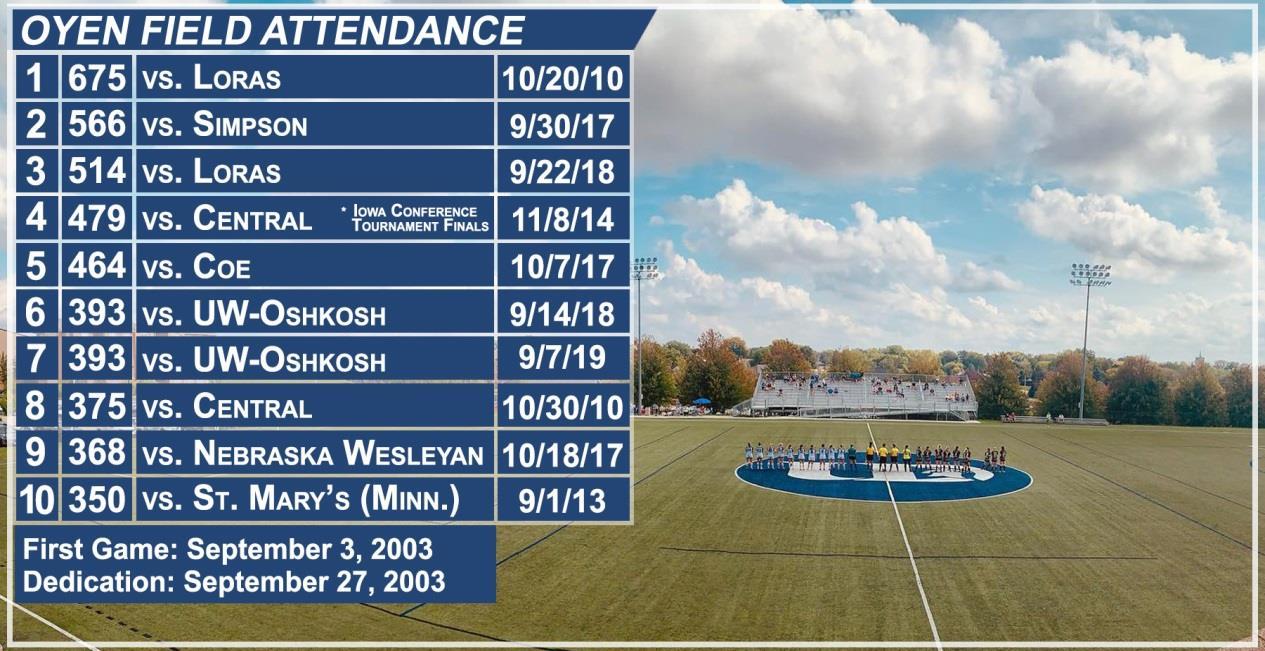 2019: 12-5-2 (4-3-2 A-R-C) 2021: 8-9-0 (4-4-0 A-R-C) 2022: 6-5-7 (3-2-3 A-R-C) 8/30 vs. Grinnell W 2-0 9/1 vs. Grinnell W 1-0 9/1 at Grinnell T 0-0 9/4 vs. Knox W 2-0 9/4 at Bethel L 1-3 9/5 vs. Bethel T 1-1 9/7 vs. UW-Oshkosh W 1-0 9/6 at Gustavus Adolphus W 1-0 9/7 vs. Monmouth W 4-0 9/8 vs. St. Scholastica W 2-1 9/10 at Monmouth W 3-2 9/9 vs. Gustavus Adolphus T 1-1 9/13 vs. North Central L 1-2 9/15 vs. UW-Oshkosh L 1-2 9/14 at Knox W 2-0 9/17 at Monmouth W 3-2 9/18 at Lake Forest W 1-0 9/17 at UW-Oshkosh W 2-1 9/21 at UW-Eau Claire W 1-0 9/22 vs. Knox L 0-3 9/21 vs. Lake Forest T 1-1 9/22 at UW-Stevens Point L 0-1 9/25 at Wartburg L 1-4 9/24 at Luther T 1-1 9/28 at Buena Vista W 11-1 9/29 at UW-Platteville L 0-1 9/27 vs. UW-Platteville L 0-1 10/2 vs. UW-Platteville W 2-0 10/2 vs. Nebraska Wesleyan W 3-0 10/1 vs. Central T 1-1 10/5 vs. Nebraska Wesleyan L 0-1 10/6 at Loras L 1-3 10/5 at Coe W 5-0 10/9 at Wartburg W 2-1 10/9 vs. Coe W 4-0 10/8 vs. Wartburg T 2-2 10/12 at Central T 1-1 10/12 vs. Simpson L 0-3 10/11 vs. Loras L 0-4 10/15 vs. Luther T 1-1 10/16 at Buena Vista W 5-0 10/15 at Nebraska Wesleyan W 3-1 10/23 at Loras L 0-6 10/20 vs. Luther L 0-2 10/19 at UW-La Crosse L 0-7 10/26 vs. Simpson W 1-0 10/23 at Central W 3-1 10/22 at Simpson L 1-5 10/29 vs. Coe W 2-0 10/30 at Luther L 0-1 10/25 vs. Buena Vista W 5-0 11/2 vs. Coe W 1-0 10/29 vs. Luther L 1-3 11/6 at Wartburg L 0-4 2020-21: