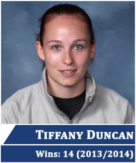 1. Tiffany Duncan 16 2013 1. Natalie Baker (2007-10) 43 2. Tiffany Duncan 16 2014 2. Tiffany Duncan (2011-14) 40 3. Natalie Baker 15 2009 3. Victoria Roethler (2017-20) 39 4. Victoria Roethler 14 2018 4. Brittney Lund (2004-07) 22 5. Brittney Lund 12 2005 5. Cecelia Zangara (2001-04) 15 6. Victoria Roethler 12 2019 6. Megan Moll (2015-18) 10 7. Natalie Baker 11 2010 7. Loisann DeLass (2009-12) 9 8. Natalie Baker 9 2007 8. Kaitlin Laithauser (2006) 8 9. Loisann DeLass 9 2012 9. Paige Dykstra (2015-18) 8 10. Multiple tied with ….. 8 10. Cadence Martindale (2021) 7
