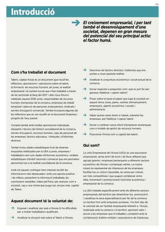 diversos. També inclou dades estadístiques fruit de diverses enquestes realitzades per la UEA a joves, empreses i treballadors així com dades d’informes econòmics i anàlisis estadístiques d’àmbit nacional i comarcal que ens permeten aproximar-nos a la realitat sociolaboral de la comarca. Amb tot aquest contingut hem intentat recollir les informacions més destacades i amb una aposta positiva i de millora, presentem la informació treballada, les conclusions assolides i idees pel futur, per avançar, com a societat, cap a una Anoia que pugui ser, encara més, capital de Talent.