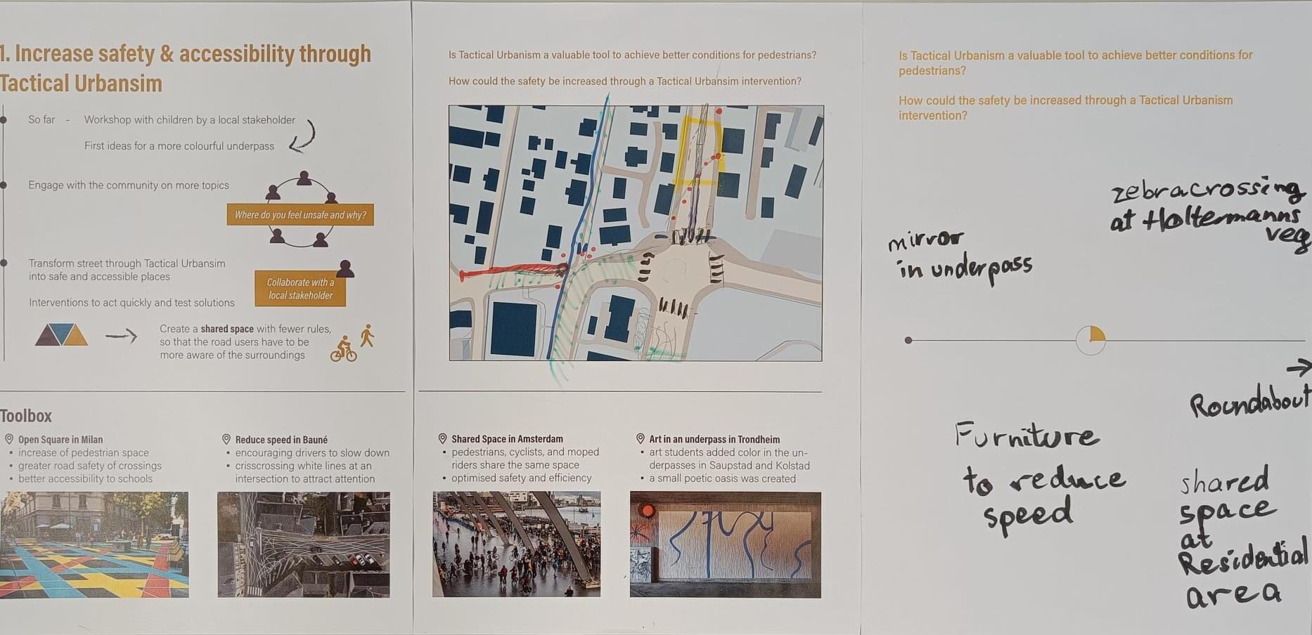 During this semester, the UEP program worked in close collaboration with Trondheim Municipality. This is the first time such a collaboration was established in Norway for the fieldwork, which was planned envisioning mutual benefits for the students’ learning process and the development of plans and programs by the municipality. The location for the fieldwork – Tempe and Sorgenfri, the focus of one the municipality’s ongoing area-based programs – was decided together. From the very beginning, students were provided with official reports and documents about the area as well as contacts for local stakeholders. This was the base information that they had to complement (and challenge!) by conducting their own situational analysis and identification of a problem statement through participatory planning methods.