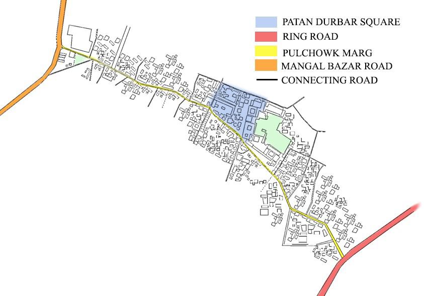 The main entry road (Mangal bazar road) is connected to the ring road in the east and Pulchowk marg (road) in the west (fig 102) The ring road and Pulchowk marg is within 800m distance from the square. The site is accessible for all the users; bike, car, and pedestrian.