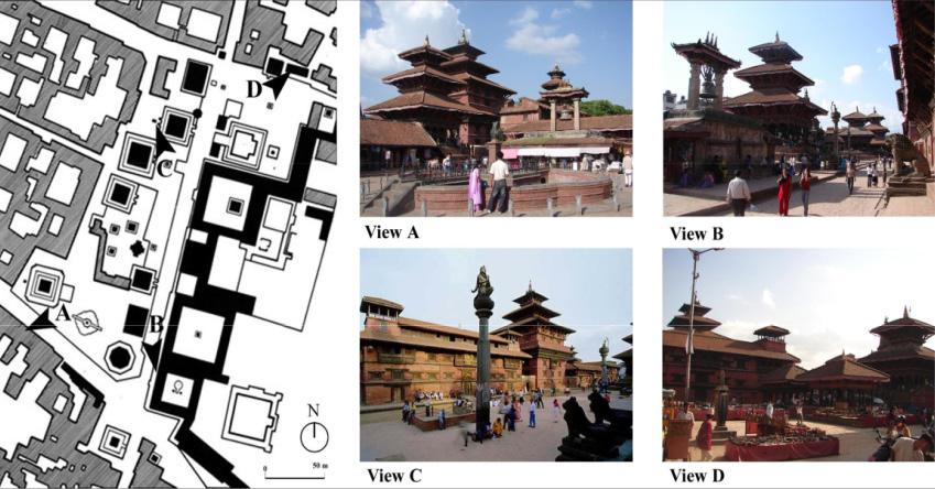 The planning of the durbar square is formal and geo metric (Tiwari, 1988). However, the spaces within the square are irregular in shape which is in strong contrast with the built structures which are strictly regular with symmetry in both plan and elevation (Chitrakar, 2006).