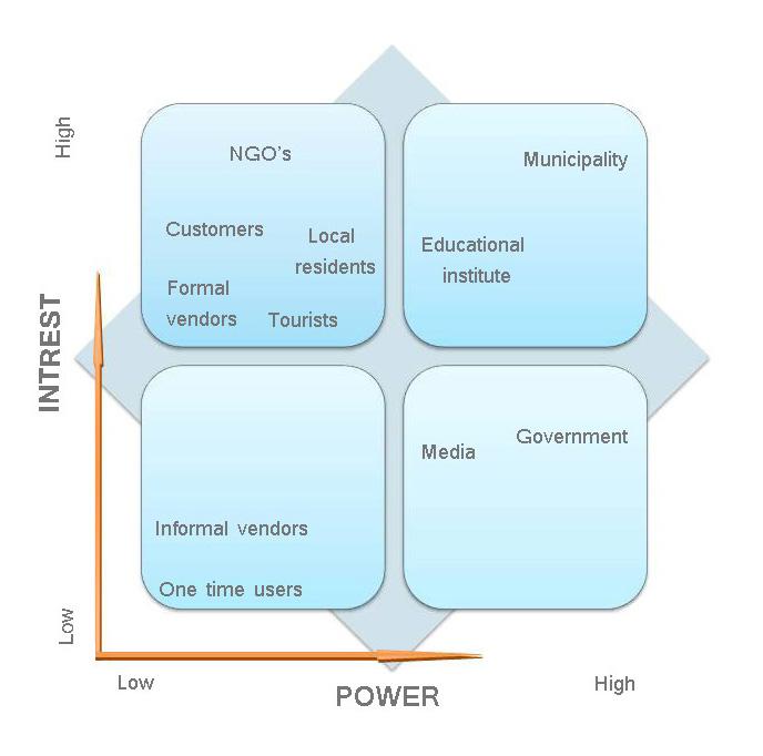 Different stakeholders of the study area were identified. A stakeholders mapping was done to analyze the power and interest of the stakeholders who affect or are affected by the outcomes.