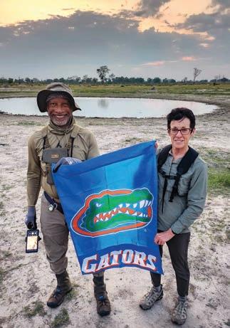 The Gator Nation is Everywhere: Joan Carroll, MAPE '84, Ph.D. '92, and Benny Vaughn, BSHSE '85, send greetings on a recent trip to Botswana. >>