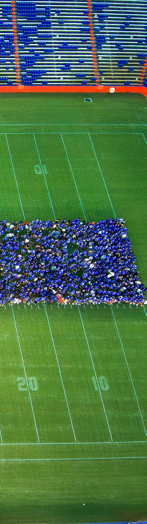 Etidyan UF nan ane 2028 la te klase nan fòmasyon "Flying F"; sou teren foutbòl nan Ben Hill Griffin Stadium.
