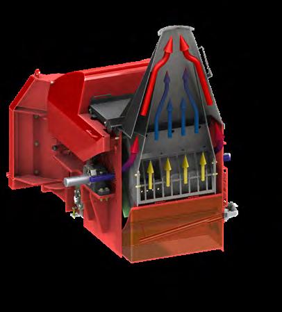 Allt material dras in med en inmatningsvinkel under 50 grader. Vinkeln hjälper de 2 knivarna att mata in materialet, utöver de aggressiva inmatningsvalsarna, vilket gör inmatningen på denna maskin mycket kraftfull.