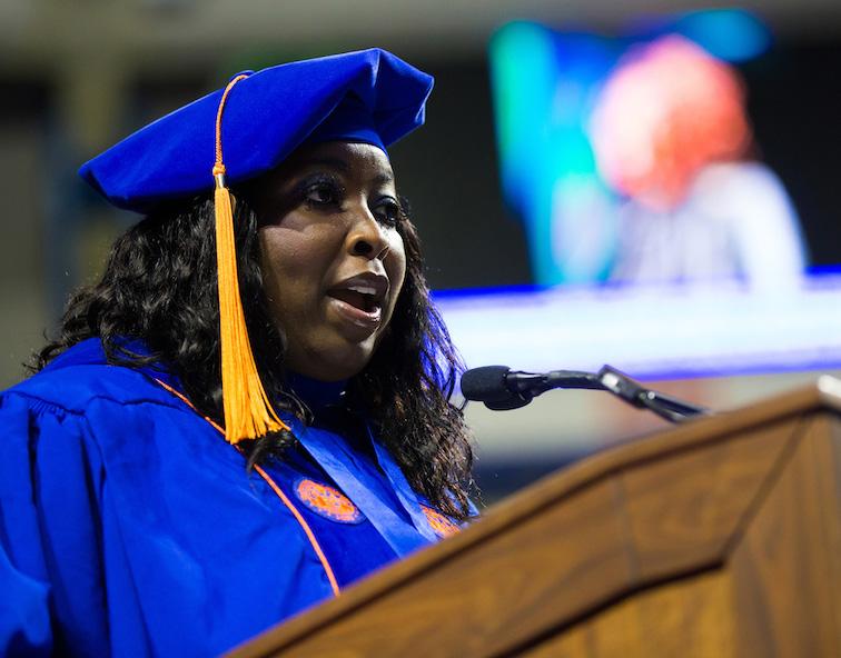 Sanethia Thomas earned a Ph.D. in human-centered computing from CISE and was advised by Juan E. Gilbert, Ph.D. , The Banks Family Preeminence Endowed Professor and department chair. She spoke during the Herbert Wertheim College of Engineering’s Spring 2019 graduation recognition ceremony for Ph.D.’s, Master’s and Specialist’s degrees.