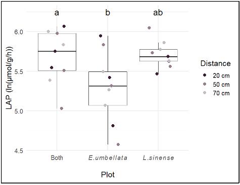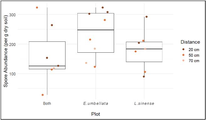 Both E. umbellata and L. sinense associate with arbuscular mycorrhizal fungi, or AMF. AMF form mutualistic interactions with host plants through which plants receive nutrients, especially phosphorus, via fungal root hyphae, and fungi receive plant carbon (Hawkins et al.). This association is particularly beneficial for plants under nutrient-limited scenarios. E. umbellata, an N-fixer, may increase soil nitro-