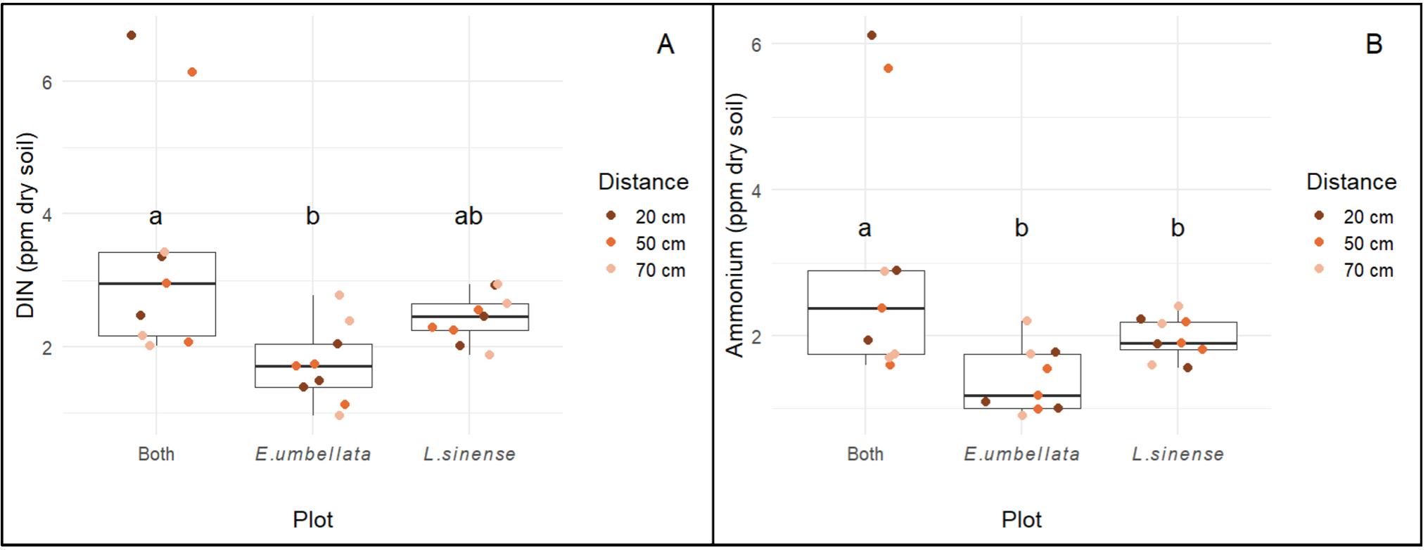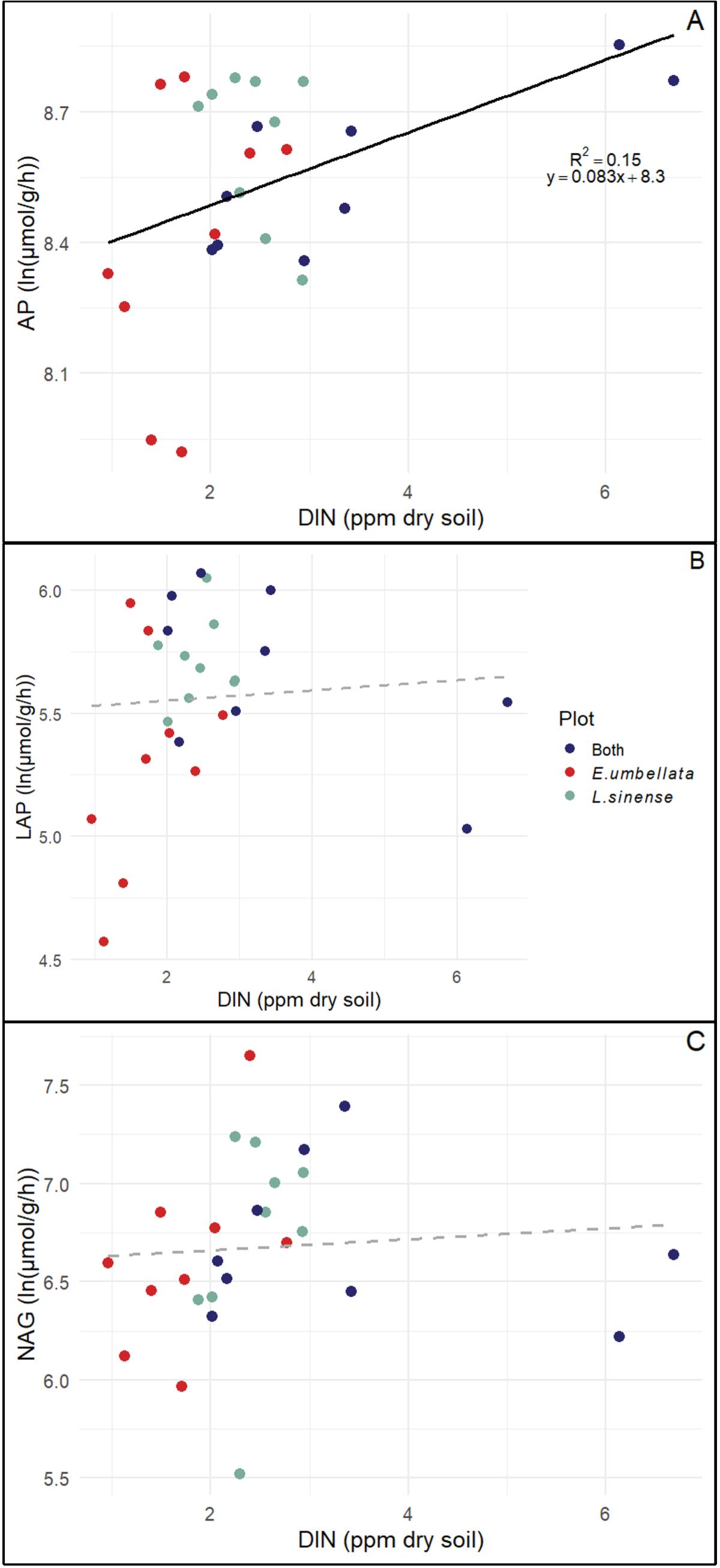 In light of the above, I hypothesize that: 1) inorganic nitrogen concentration will be highest in E. umbellata only plots, followed by plots with both shrub species, then the L. sinense only plots; 2) N-degrading enzyme activity