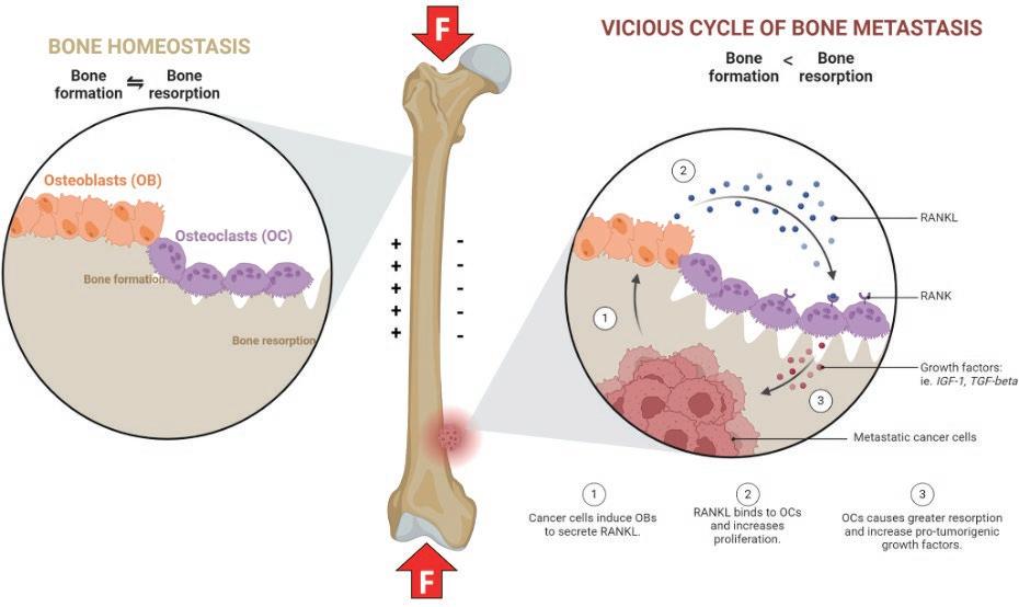 process of bone remodeling (Tahara et al.) (see Fig. 4). With so many ties between bone tissue remodeling and disease, it is important to capture this dynamic activity in vitro. To do this, we propose that introducing bioelectricity into a novel 3D breast cancer bone metastasis model will increase the physiological accuracy of the modeling system. To achieve this effect, our model consists of a 3D printed scaffold made of polycaprolactone (PCL), demineralized bone matrix (DBM), and polyvinylidene fluoride (PVDF). PVDF is a widely known piezo-polymer that produces an electrical output when mechanically stimulated. In this model, ultrasound will be used to deliver mechanical stimulation. Through this convention, users can modulate how frequently this biomimetic bone tissue is experiencing mechanical loading. This gives researchers the ability to investigate how differing amounts of piezo-