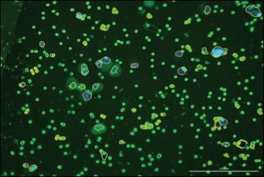 Fig. 12. Image of migrated breast cancer cells (MDA-MB-231). Cell bodies are probed with Cell Tracker Green and used to display the presence of a cell. Cell nuclei are shown in blue using NucBlue probes. Cell count software is used to count the number of nuclei.