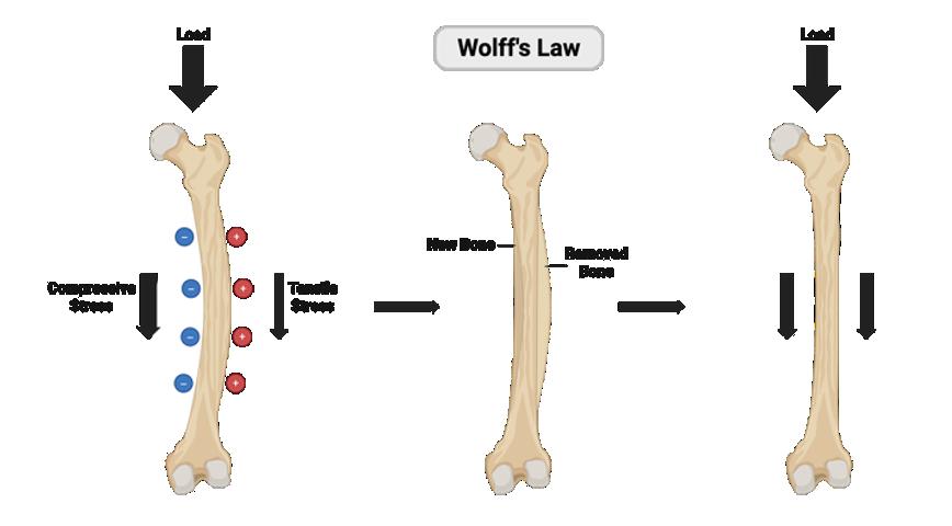 Fig. 1. Mechanical remodeling of bone tissue. Electrical signaling is observed in bone under applied mechanical loading. Created with biorrender.com.