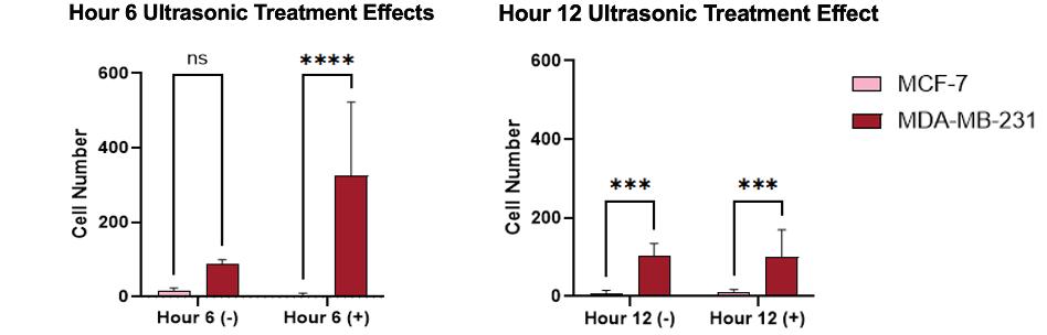 At 6 hours after introducing the breast cancer cells into the modeling system, a significant difference was shown between cancer cell lines. The aggressive breast cancer cell line displayed significantly more migration than the cancer line with low aggression, just as we see in vivo. Without the piezoelectric component, the two cancer types did not behave differently. At 12 hours after introducing the breast cancer cells into the modeling system, significant differences are seen between the cell lines in both treatment groups. These results can be explained by one of two reasons: Transwell migration is affected by gravity which is a common limitation in this type of experiment, or ultrasonic treatment was delivered only once before the cancer cells were introduced.