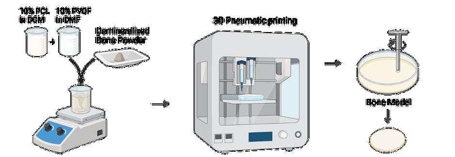 Fig. 6. Piezoelectric bone model fabrication. 3D porous scaffolds were made by dissolving polycaprolactone (PCL) in dichloromethane (DCM) and polyvinylidene fluoride (PVDF) in dimethylformamide (DMF) then fabricated using a BIO X pneumatic bioprinter and cut to size using a metal punch.
